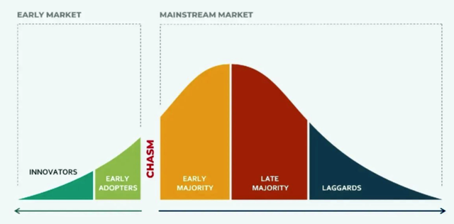 其中,早期采用者(2.5%)与早期大众(34%)之间的市场断层,被称为“创新鸿沟”。绝大多数创新产品都会倒在这道鸿沟之前,但只要成功跨越鸿沟,就能迎来爆发式的快速增长。